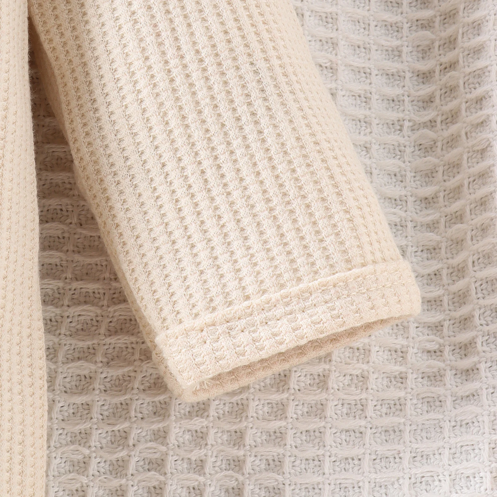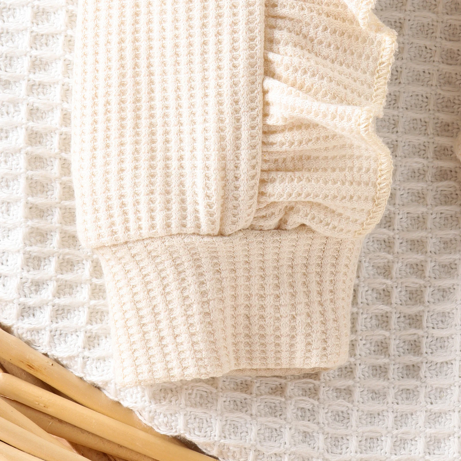 2PCS Autumn New Style 0-1 Year Old Girl Baby Sweet And Cute Solid Color Flying Sleeve Waffle Long-Sleeved Jumpsuit + Hair Band